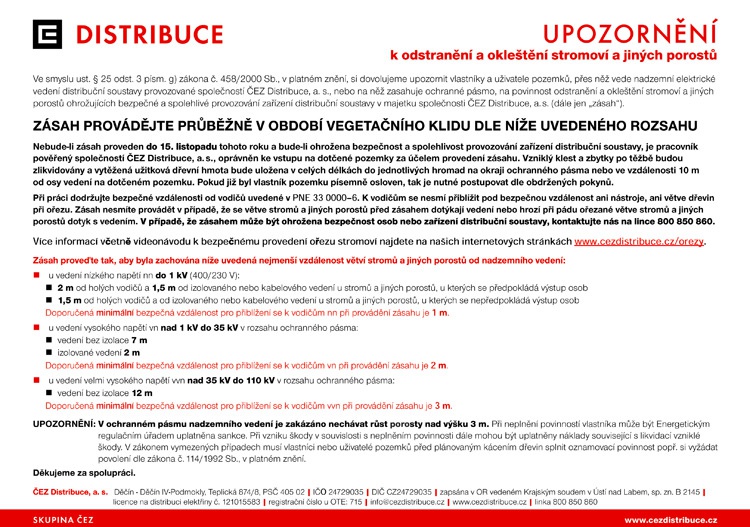 ČEZ - Upozornění k odstranění a okleštění stromoví