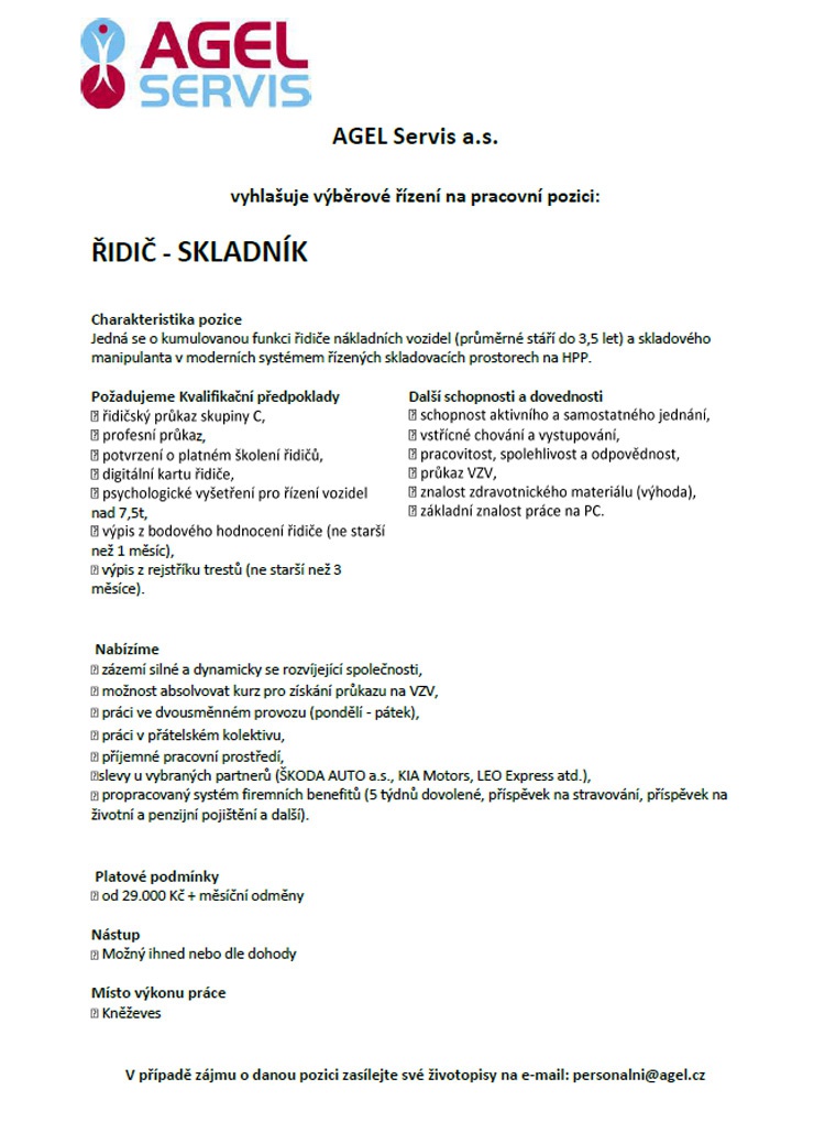 AGEL Servis a.s. vyhlašuje výběrové řízení na pracovní pozici Řidič - skladník. Více informací v přiloženém letáku.