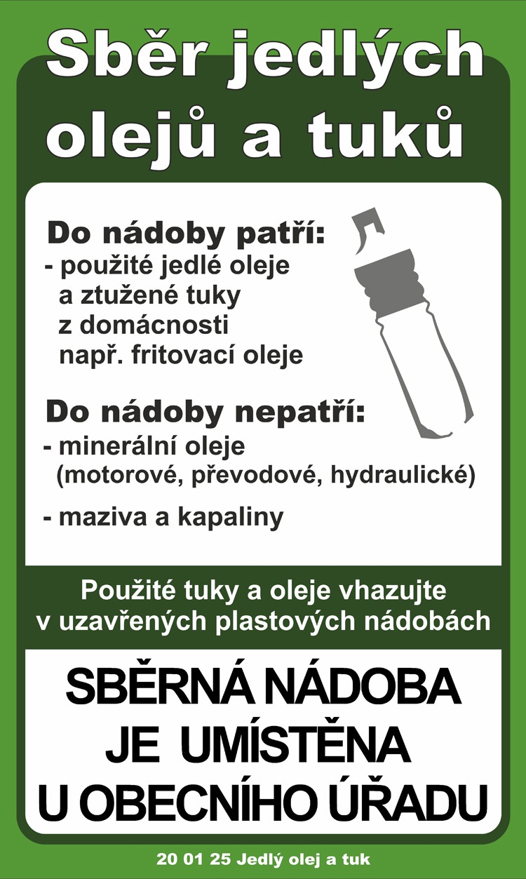 Do nádoby NEPATŘÍ: technické oleje, maziva a kapaliny. Zde níže dále přikládáme rovněž informační leták. Obecní úřad Kněževes