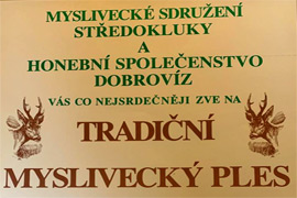 Myslivecké sdružení Středokluky a Honební společenstvo Dobrovíz Vás co nejsrdečněji zve na TRADIČNÍ MYSLIVECKÝ PLES, který se koná v KD v Kněževsi 14.1.2023 od 20:00 hod. K tanci hraje RETRO BAND. Vstupné 100,- Kč. Velká a bohatá myslivecká tombola. Zábava a tanec - úbor společenský. Těšíme se na Vaši návštěvu.