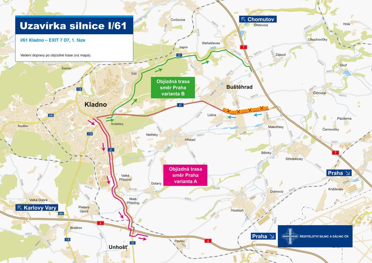 V pondělí 11.10.2021 zahájíme předáním staveniště stavební akci „I/61 Kladno – exit 7 D7 II. etapa a D7 MÚK Exit 7 LS+PS – oprava povrchu a odvodnění". Na podzim opravíme 2 levé větve MÚK EXIT 7 Buštěhrad. Z tohoto důvodu budou postupně opravované větve uzavírány a provoz v navazujícím úseku na silnici I/61 za odbočku na Lidice bude veden pouze jednosměrně na Kladno. Pro opačný směr budou značeny objízdné trasy přes D7 EXIT 9 Bouchalka nebo přes D6 EXIT 12 Unhošť, vizte mapu zde níže a v příloze v PDF.