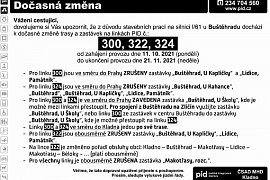 - ve dnech 9. 10. a 10. 10. jsou cestující z technických důvodů informování pouze informační vývěskou; do jízdních řádů je výluka zapracována k 11. 10. 2021