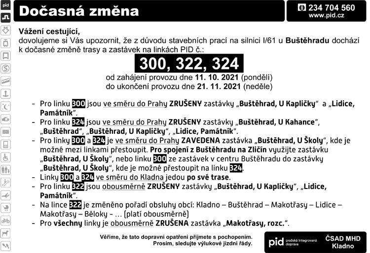 - pro linku 324 jsou ve směru do Prahy zrušeny zastávky „Buštěhrad, U Kahance", „Buštěhrad", „Buštěhrad, U Kapličky", „Lidice, Památník"