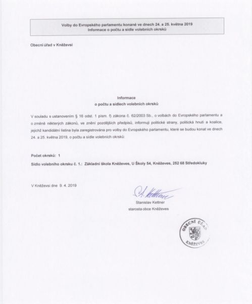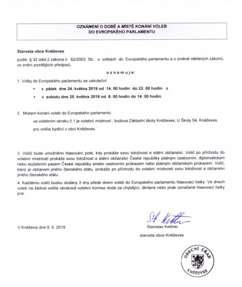 | Volby do Evropského 2019 doc. 3 [PNG, 220.5 kB, Změněno: 9. 5. 2019] Oznámení o době a místě konání voleb do Evropského parlamentu |