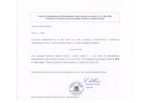 | Volby do Zastupitelstva Středočeského kraje, konané ve dnech 2. a 3. října 2020 - oznámení o svolání prvního zasedání okrskové volební komise [PNG, 133.5 kB, Změněno: 3. 9. 2020] | |
